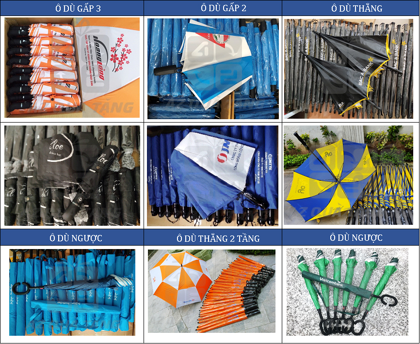 Hiện nay trên thị trường có rất nhiều loại ô dù với mẫu mã, chất liệu đa dạng. Các loại ô dù in logo phổ biến là: Ô dù thẳng, Ô dù gấp 2, Ô dù gấp 3, Ô dù gấp ngược (Dù thông minh), Ô dù ngoài trời.
