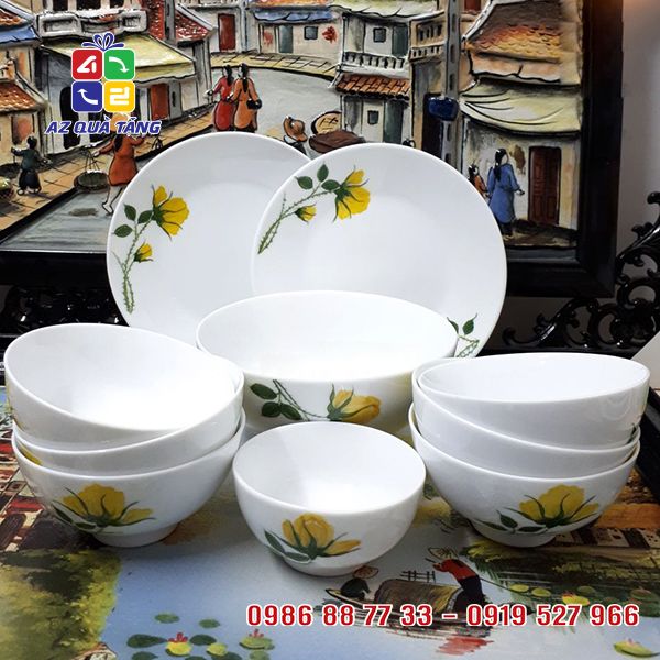 Bộ bát đĩa hoa hồng vàng được làm từ chất liệu sứ Bát Tràng cao cấp, họa tiết hoa văn trên bát được vẽ thủ công rất sinh động, đẹp mắt là món quà tặng, đồ dùng gia đình độc đáo và giá trị.