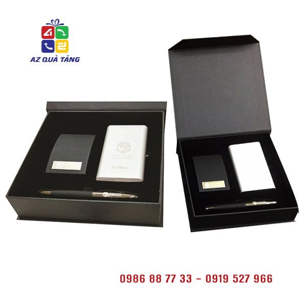 Bộ quà tặng Tân Cảng gồm Pin sạc dự phòng, Bút ký và Hộp đựng namecard, các sản phẩm đều được khắc logo, là món quà tặng ý nghĩa gửi đến quý khách hàng của công ty.